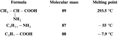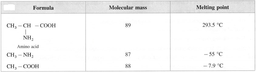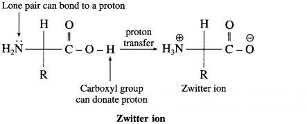 Above compounds have same molecular masses but they have different melting points, a-amino acids have higher melting points compared to the corresponding amines or carboxylic acids of comparable masses. This property is due to the presence of both carboxylic group (acidic) and amino group (basic) in the molecule. In aqueous solution, protons transfer from acidic group to amino (basic) group of amino acid forms a salt, which is a dipolar ion called – Zwitter ion.
