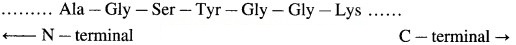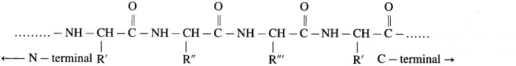 Primary structure of proteins is the sequence of constituent a-amino acid residues linked by peptide bonds. Any change in the sequence of amino acid residue creates different protein molecule. Primary structure of proteins is represented by writing the three letter symbols of amino acid residues as per their sequence in the concerned protein. The symbols are separated by dashes. According to the convention, the N-terminal amino acid residue as written at the left end and the C-terminal amino acid residue at the right end.