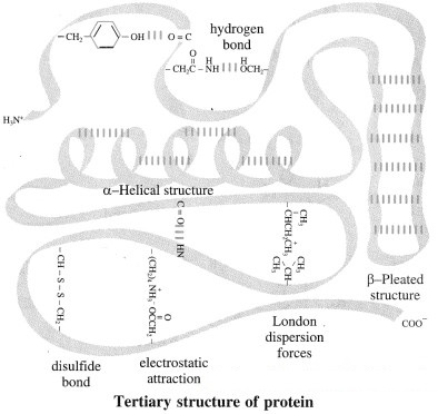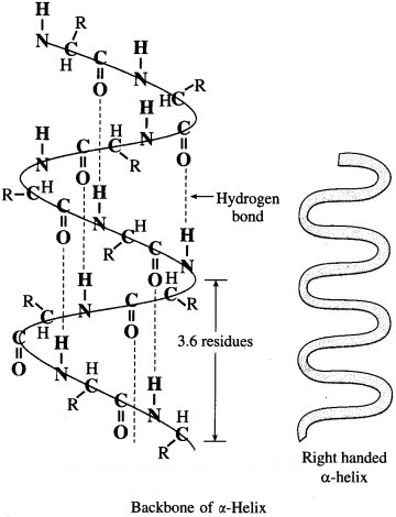 (2) Secondary structure of proteins : The three-dimensional arrangement of lαalized regions of a long polypeptide chain is called the secondary structure of protein. Hydrogen bonding between N-H proton of one amide linkage and C = O oxygen of another gives rise to the secondary structure. There are two different types of secondary structures i.e. α-helix and β-pleated sheet.