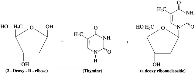 On complete hydrolysis DNA yields 2-deoxy-D-ribose, adenine, thymine, guanine, cystosine and phosphoric acid. Since adenine always forms two hydrogen bonds with thymine, the hydrolysis of DNA gives equimolar quantities of adenine and thymine.